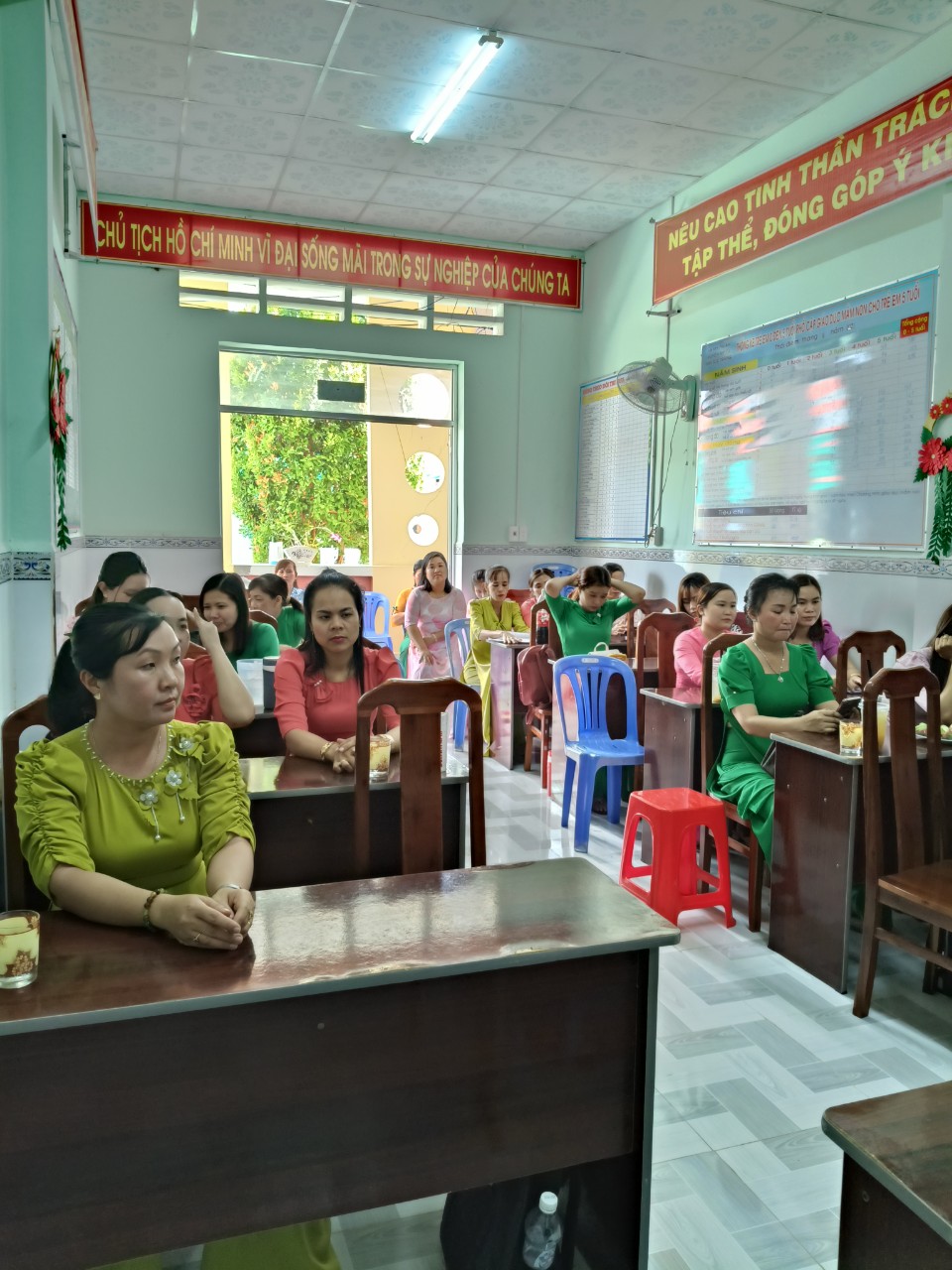 Hình ảnh trao giấy chứng nhận "Giỏi việc trường đảm việc nhà" cho các công đoàn viên của trường mầm non Mỹ Thuận.